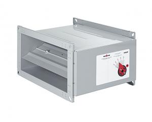 Mechanischer VK2 Volumenstromregler zum lageunabhängigen Einbau in Lüftungsleitungen für Zuluft und Abluft raumlufttechnischer Anlagen. Das eckige Gehäuse mit den Nenngrößen von 200 mm x 100 mm bis 600 mm x 300 mm (B x H) und die Regelmechanik bestehen aus verzinktem Stahlblech. Über eine Stelleinrichtung mit Drehzeiger, Skala und Arretierung wird der Volumenstromsollwert vorgegeben. Der Volumenstrombereich liegt zwischen Vmin=200 m³/h bis Vmax= 7.000 m³/h, der Druckbereich zwischen 50 Pa und 1.000 Pa. Die Einstellung erfolgt manuell oder optional motorisch.