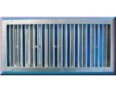 Kanalgitter verzinkt für Zuluft und Abluft, mit Rahmen und einstellbaren Strahllenklamellen aus profilliertem, vertinkten Stahl. SKS mit senkrechten Frontlamellen. Rückseitig mit Schlitzschieber.